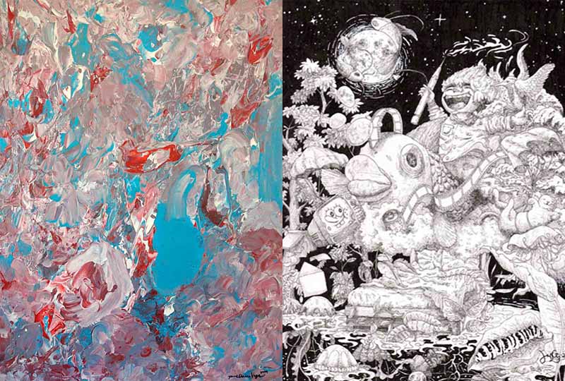 (Left) Blue 1. Jeane Claire Vega. 61cm x 81cm. Php20,000. Tinta Artists Iligan(Right) Little Wonders. Jefferson Cortez. Ballpoint Pen; 30cm x 21cm. Php2,000. Datu Bago Gallery